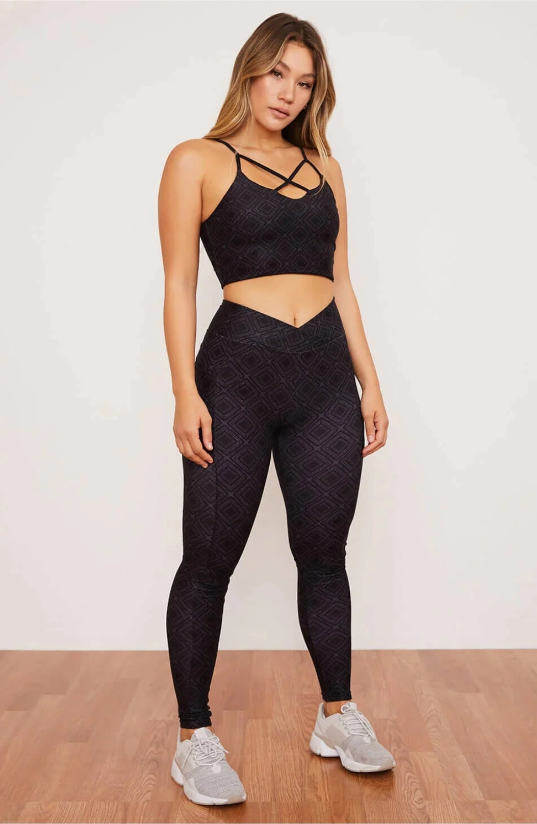 A sleek black activewear set featuring a strappy crop top and matching high-waisted leggings with a subtle geometric diamond pattern. Designed for both comfort and performance, the outfit pairs effortlessly with gray sneakers, making it ideal for gym sessions or casual athleisure wear.